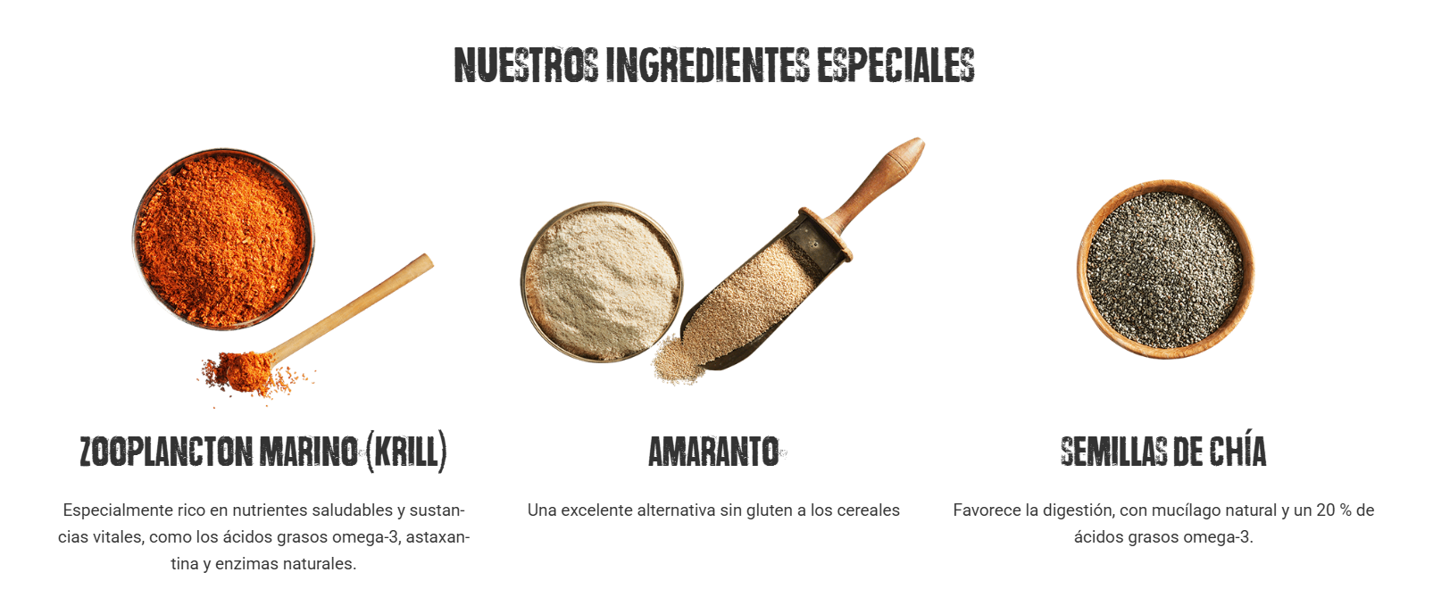 Salmón fresco (30 %); harina de pescado de agua salada (20 %); amaranto (15 %); harina de guisantes; fécula de patata; grasa de ave; zooplancton marino, molido (krill, 5 %); huevo, secado (5 %); hígado de ave, hidrolizado; levadura de cerveza, secada (2,5 %); semilla de uva prensada en frío; semillas de chía (1,3 %); vainas de algarroba, secas; cloruro de potasio; inulina de achicoria.