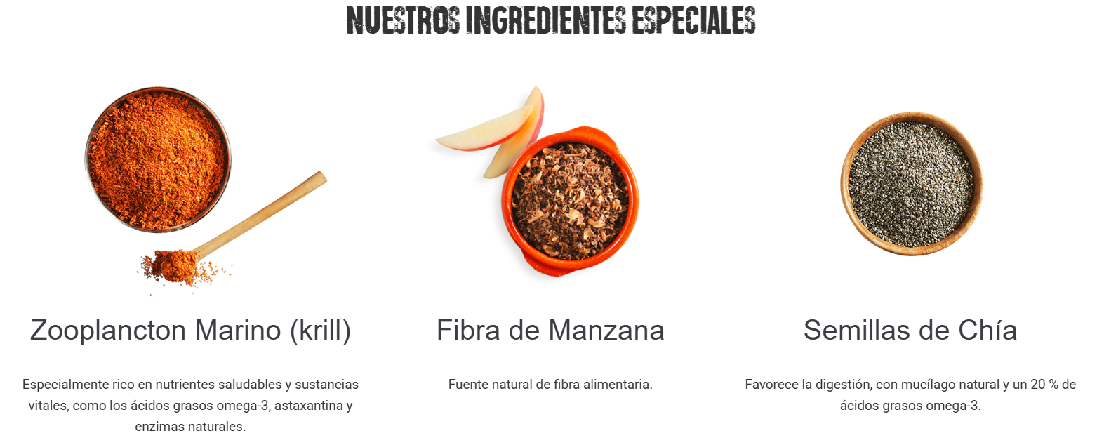 Carne de ave fresca (30 %); proteínas de ave, bajo contenido en cenizas, secadas (23 %); arroz; maíz; harina de pescado de agua salada (9 %); pulpa de manzana, secado (4 %); hígado de ave, hidrolizado; centeno, malteado; huevo, secado; zooplancton marino, molido (krill, 2,5 %); salvado de avena (2,5 %); levadura de cerveza, secada; semillas de chía (1,3 %); grasa de ave; cloruro de sodio; cloruro de potasio; inulina de achicoria.