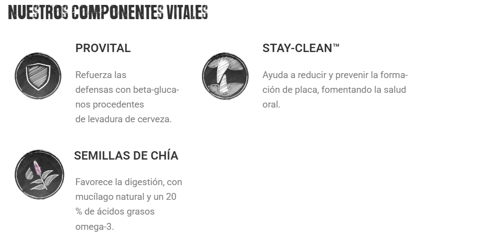Carne de ave fresca (30 %); proteínas de ave deshidratadas con bajo contenido en cenizas (24 %); amaranto (10 %); fécula de patata; grasa de ave; harina de guisantes; harina de caballa (5 %); hígado de ave hidrolizada; zooplancton marino molido (krill, 2,5 %); levadura de cerveza inactivada secada (2,5 %); harina de pescado de agua salada; huevo secado; semillas de chía (1,3 %); algarroba tronzada, secado; cloruro potásico; inulina de achicoria.
